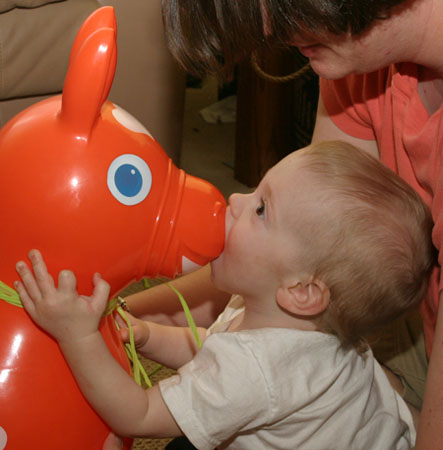 and bounces up and down. Other times, he bites it on the nose.